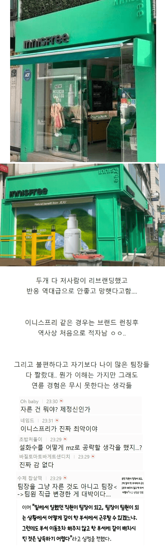 또한 네티즌들은 "이니스프리 바뀐 거 진짜 최악이다" , "원래 좋았던 브랜드를 왜 손대서 망쳐놓냐" , "일은 진짜 못 하긴 한다" , "설화수를 어떻게 MZ로 공략할 생각을 하냐. 진짜 감 없다" 등의 바난을 했다.